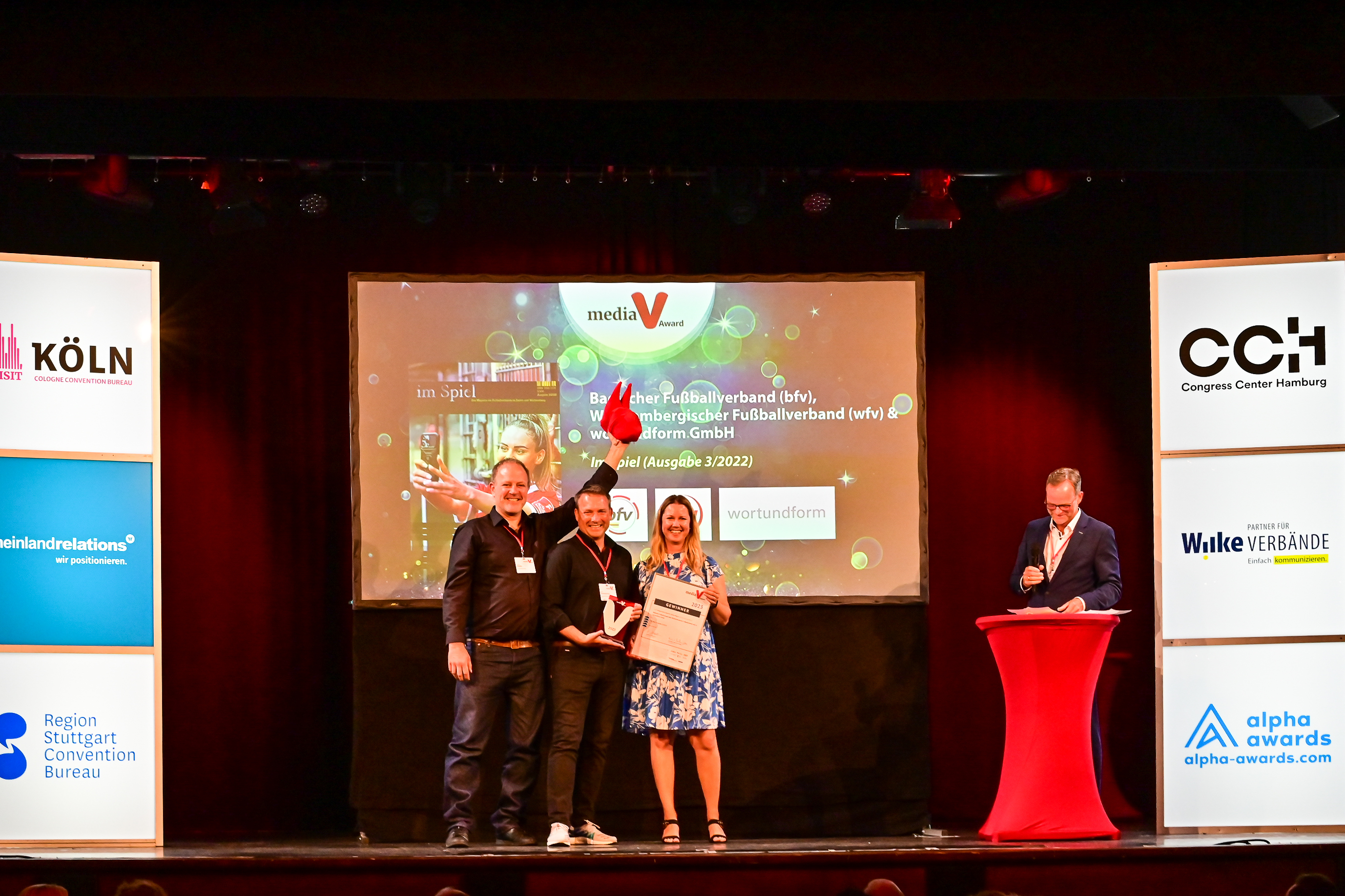 “Eindrucksvolle Bildsprache, breite Themenauswahl, kritischer Dialog, ansprechende Haptik und konsequente Diversität”, so sieht die zehnköpfige Jury das Magazin “im Spiel” der drei baden-württembergischen Fußballverbände. Für dieses Gesamtpaket gab es in der Kategorie “Beste Zeitschrift/ Bestes Magazin 2023” den Siegerpreis bei der Verleihung des mediaV-Award in Köln. Andreas Wilke, Geschäftsführer der Wilke Mediengruppe, fand in seiner Laudatio für “im Spiel” anerkennende Worte für die Verbandskommunikation auch angesichts der überwiegend ehrenamtlichen Zielgruppen. Annette Kaul (Badischer Fußballverband), Heiner Baumeister (Württembergischer Fußballverband) und Fabian Diehr (Büro wortundform) nahmen den Preis im Volkstheater entgegen.