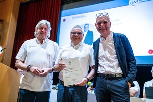 Eine große Ehre wurde Mannheims Kreisvorsitzendem Harald Schäfer zuteil. Er erhielt für seine Verdienste die DFB-Ehrennadel von Bernd Neuendorf persönlich überreicht. Auf stolze 47 Jahre ehrenamtliches Engagement blickte Zimmermann in seiner Laudatio über Schäfers Wirken zurück. Gestartet als Jugendtrainer und -betreuer beim SV Waldhof Mannheim folgte nach 15 Jahren die Tätigkeit des Schriftführers der Jugendabteilung, bevor es ihn zum Fußballkreis zog. Staffelleiter, Jugendleiter, stv. Kreisvorsitzender und schließlich gelangte Harald Schäfer an die Spitze des Fußballkreises Mannheim, dessen Führung er bis heute innehat. Dafür erhielt er bereits allen Ehrungen des Badischen Fußballverbandes und nun auch die DFB-Verdienstnadel.