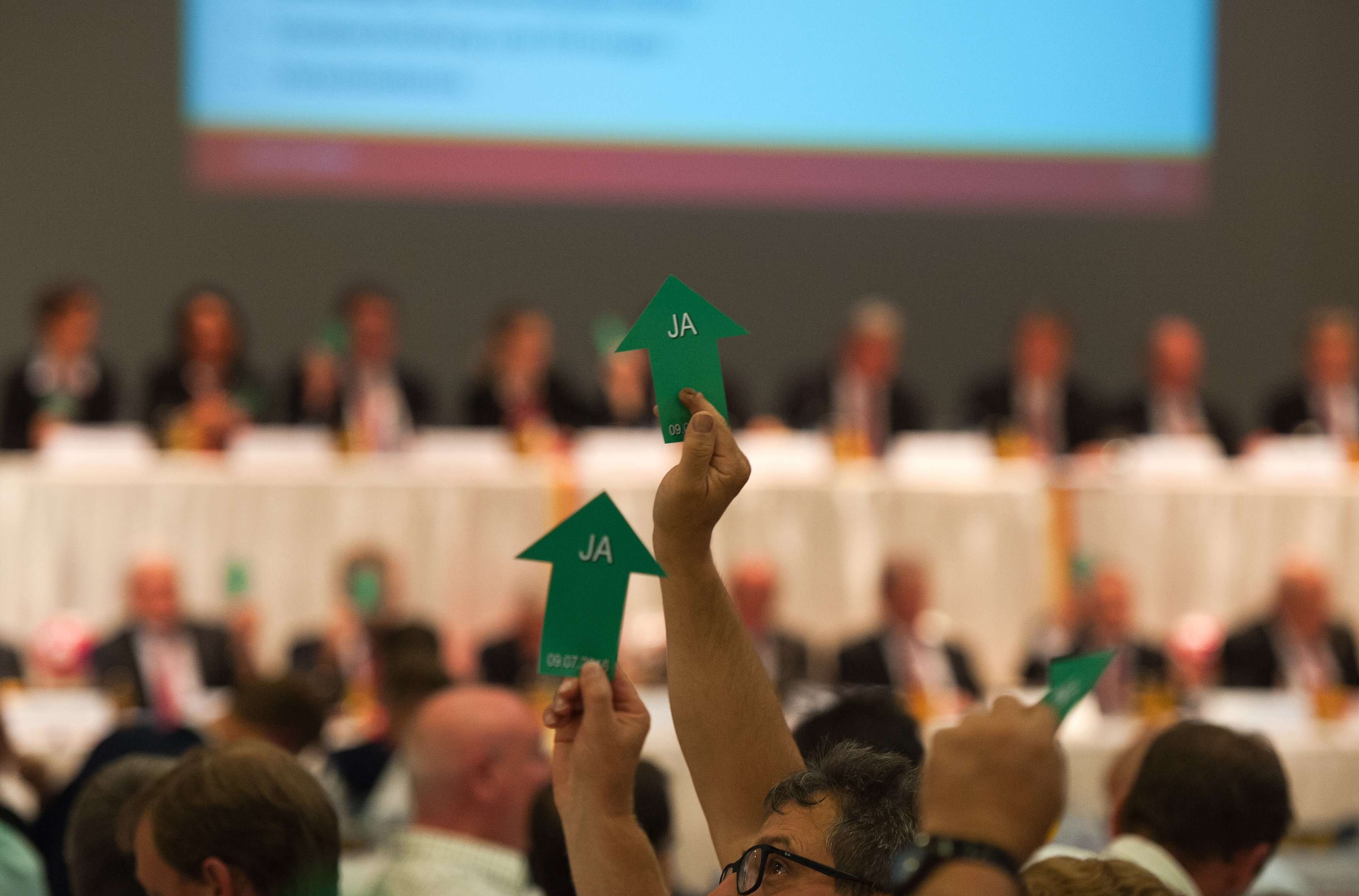 Und dann war es soweit. Prof. Dr. Andreas Pitz, Vorsitzender des Verbandsgerichts, ging zum Tagesordnungspunkt 6 „Erledigung von Anträgen“ über. Nachdem die Delegierten die Anträge 1 Dinglichkeit (99 %) und Antrag 2 Haftungsbeschränkung (98 %) abgewinkt hatten, kam der entscheidende Antrag 3 zum Spielbetrieb.