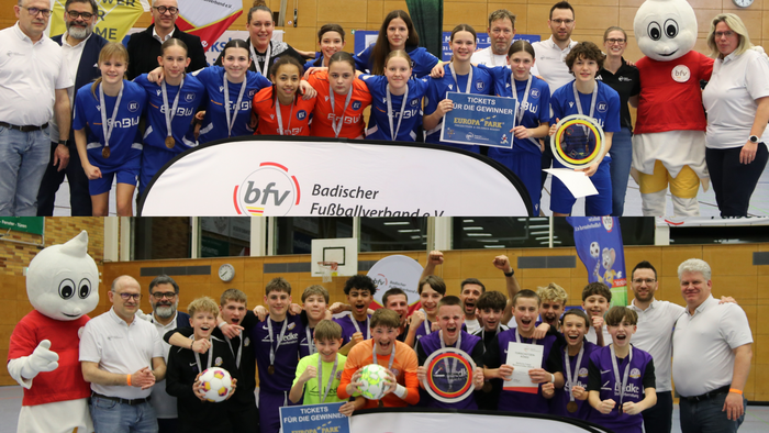 Im Anschluss sollte der badische Futsal-Meister der C-Junioren 2025/26 ermittelt werden. Mit bfv-Maskottchen Badi an seiner Seite, begrüßte Verbandsjugendleiter Rouven Ettner die zehn Teams. Nach einer umkämpften Gruppenphase gelang es dem TSV Amicitia Viernheim und dem FV Nußloch aus Gruppe A ins Halbfinale einzuziehen. Die beiden Halbfinaltickets für Gruppe B lösten der FC Nöttingen und die SpVgg Durlach-Aue nach einem Kopf-an-Kopf-Rennen. Dank einem frühen Treffer setzt sich der TSV Amicitia Viernheim mit 1:0 gegen den FC Nöttingen durch und zog damit ins Finale ein. Die Mannschaft der SpVgg Durlach-Aue bezwang im zweiten Halbfinale den FV Nußloch qualifizierte sich somit für das Highlight des Abends. Im Spiel um Platz 3 sicherte sich der FC Nöttingen mit einem Sieg über den FV Nußloch die Bronze-Medaille. Die letzte Begegnung des Abends versprach eine spannende Partie. In einem umkämpften Spiel zeigten die Jungs der SpVgg Durlach-Aue viel Durchsetzungsvermögen und konnten mit einem 2:0 gegen den TSV Amicitia Viernheim ihre starke Leistung des ganzen Turniers noch einmal unterstreichen.