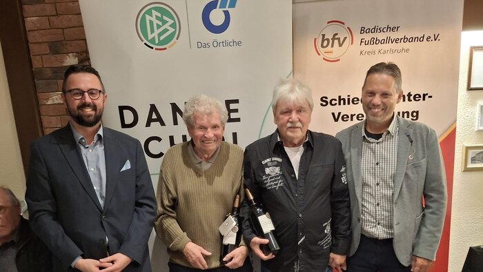 Zwischen den verschiedenen Essensgängen wurden dann Eberhard Unger für 40 Jahre und Josef Hadaschik für 50 Jahre geehrt. Der Höhepunkt war dann die Ehrung von Bernhard Füger und Edgar Hempel für sage und schreibe 60 Jahre Schiedsrichter. Alle 4 Jubilare erhielten Weinpräsente und Urkunden der Karlsruher Fußball-Schiedsrichter.