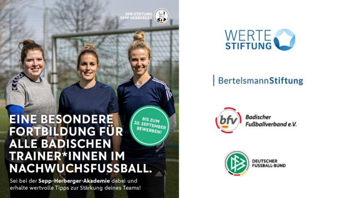 Karlsruhe. Zum vierten Mal organisieren der DFB, die DFB-Stiftung Sepp-Herberger, die Bertelsmann Stiftung und die Werte-Stiftung gemeinsam mit dem bfv die „Sepp-Herberger-Akademie“, eine Trainerfortbildung, die Praxistipps und Hilfestellungen an die Hand gibt, um die Wertebildung im Team zu stärken. In diesem Jahr findet die Veranstaltung vom 22. bis zum 24. Oktober in der Sportschule Schöneck statt.