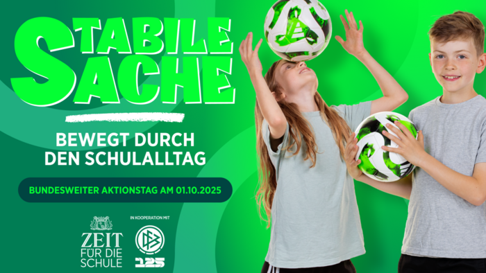 Karlsruhe. Bewegung tut gut – dem Körper und Geist. Regelmäßige Bewegungspausen im Schulalltag verbessern die Konzentrationsfähigkeit, senken Stress und stärken das soziale Miteinander in der Klasse. Deshalb organisiert der Deutsche Fußball-Bund (DFB) gemeinsam mit „ZEIT für die Schule“ am 1. Oktober den Aktionstag "Stabile Sache - Bewegt durch den Schulalltag". Anmeldungen sind bis zum 30. September möglich.