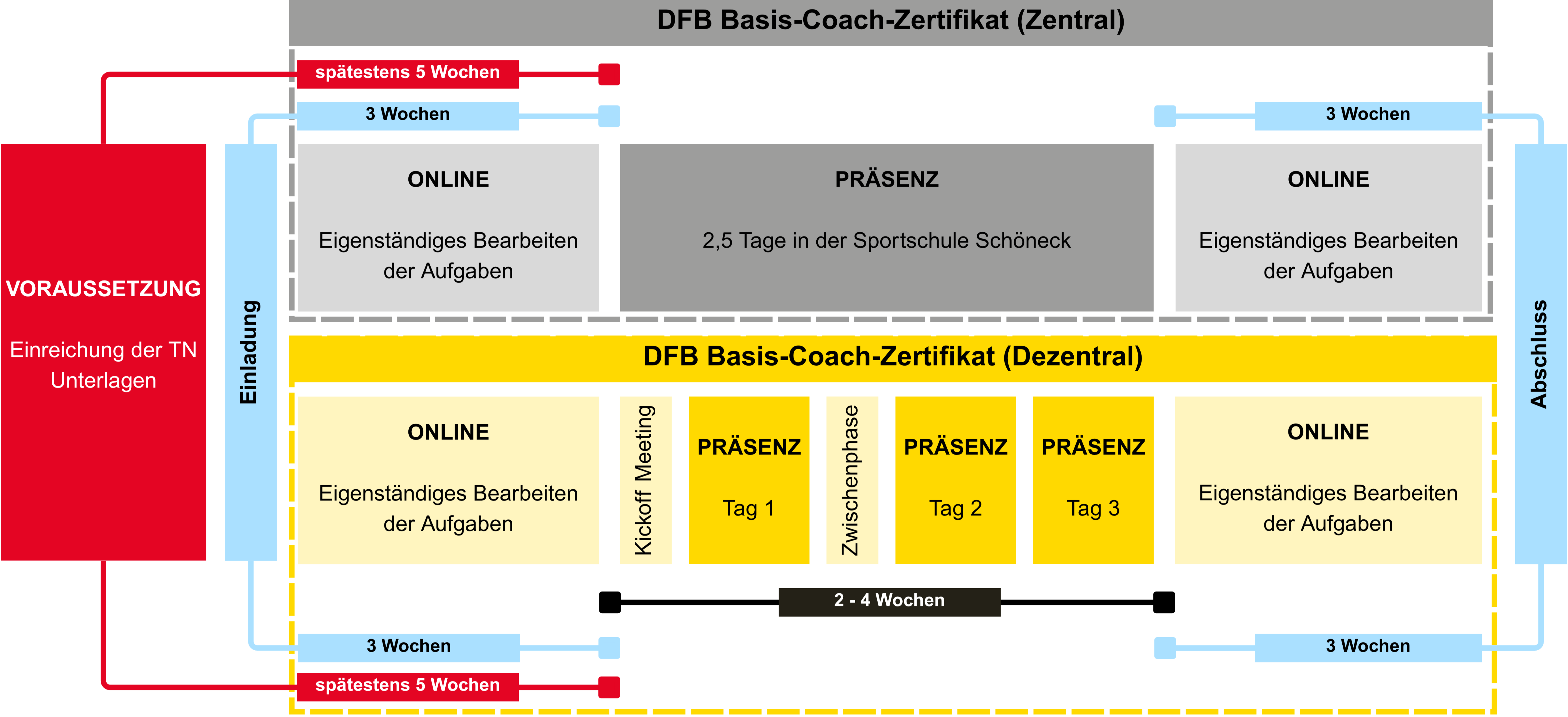 Das DFB Basis-Coach-Zertifikat ist der Einstieg in die Trainer-C-Lizenz. Es dient als niederschwellige Qualifizierungsmaßnahme und begleitet Trainer*innen bei dem an Alltagsanforderungen orientierten, prinzipiengeleiteten Erwerb von Trainerkompetenzen. Je nach Alters- und Leistungsbereich werden spezifische Anforderungen an Trainer*innen gestellt. Dennoch kann sich jede*r Trainer*in an einheitlichen Prinzipien orientieren, um Spieler*innen und Team bestmöglich voranzubringen. Ein motivierendes, spielorientiertes und lernintensives Training ist dabei der Erfolgsschlüssel in allen Spiel- und Altersklassen.