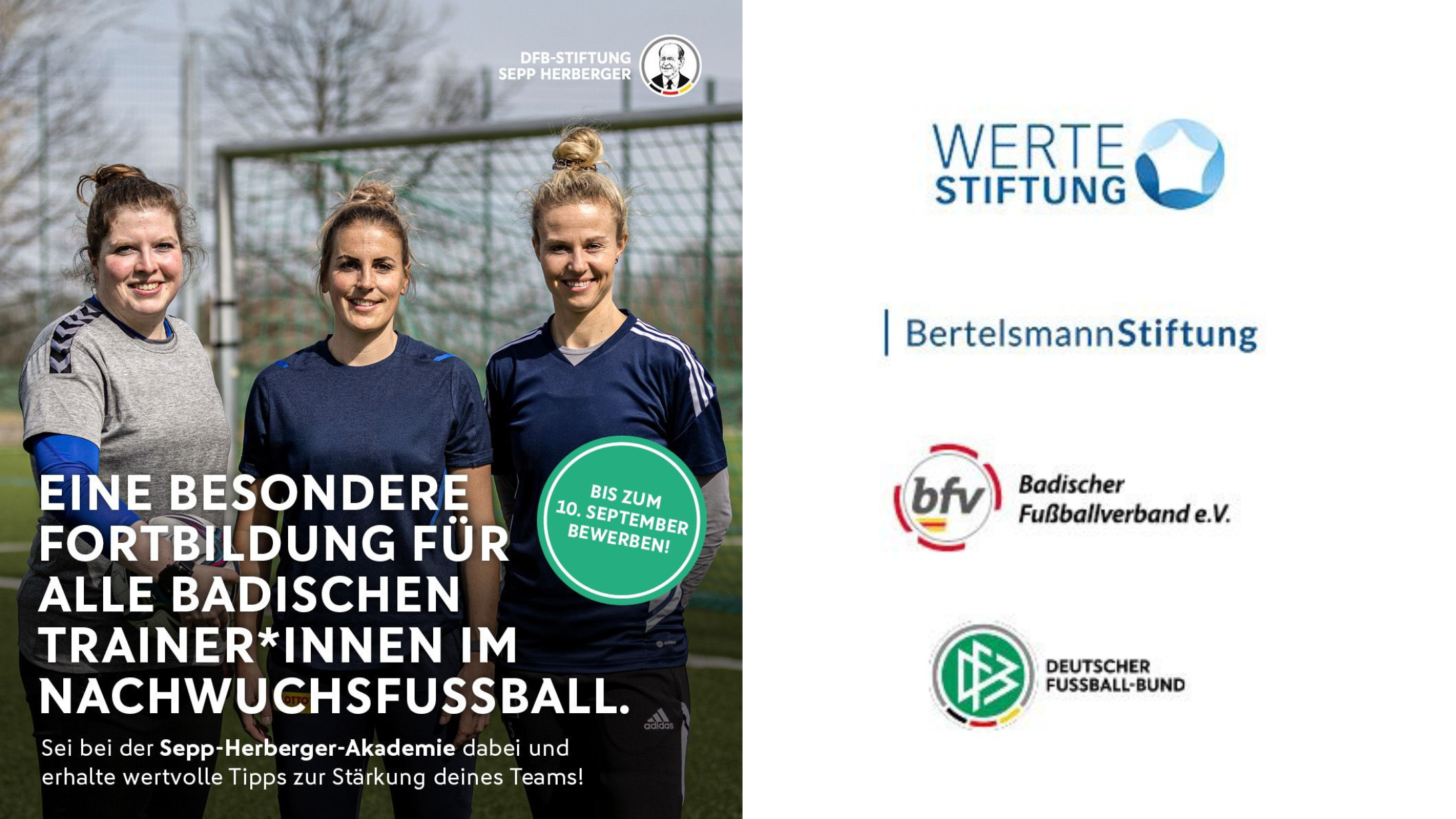 Karlsruhe. Zum vierten Mal organisieren der DFB, die DFB-Stiftung Sepp-Herberger, die Bertelsmann Stiftung und die Werte-Stiftung gemeinsam mit dem bfv die „Sepp-Herberger-Akademie“, eine Trainerfortbildung, die Praxistipps und Hilfestellungen an die Hand gibt, um die Wertebildung im Team zu stärken. In diesem Jahr findet die Veranstaltung vom 22. bis zum 24. Oktober in der Sportschule Schöneck statt.