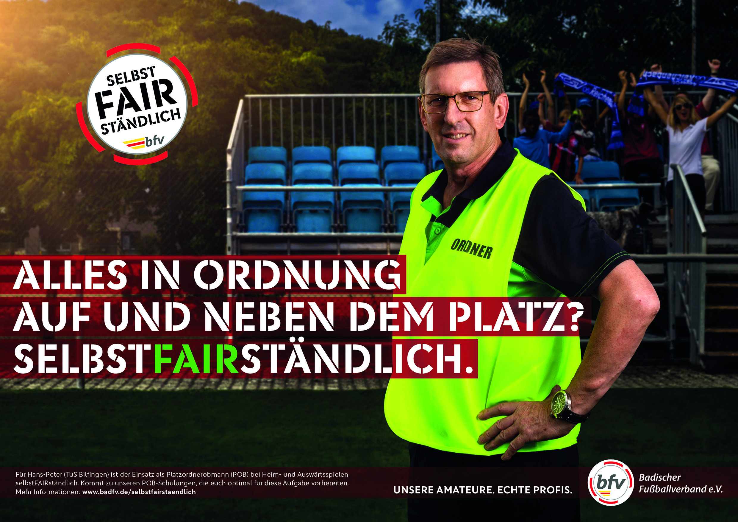Der Platzordnerobmann (POB) des Heim- und Gastvereins übernimmt wichtige präventive Aufgaben: Als freundlicher Ansprechpartner für Schiedsrichter und Zuschauer wendet er nach bestem Wissen Störungen rund um Fußballspiele ab. Jeder Heim- und Gastverein ist nach der bfv-Spielordnung zur Stellung eines POB verpflichtet.